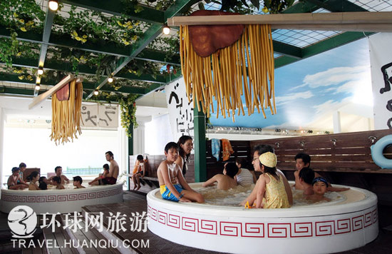 一提起日本最有名的东西,许多人会想到温泉和拉面。不过,您可能没想到这两者结合,究竟会是什么模样?那就是巨无霸海碗里,有着浓郁的豚骨高汤--原来,拉面温泉的的颜色调成近似拉面的汤头的颜色,民众坐在里头泡汤,彷佛成为配料的一部分。