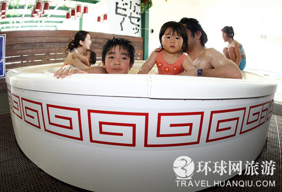 拉面温泉共有3个池子,白色的池壁外围描着一圈首尾相连的红色“回”字花纹,活脱脱一只特大号的面碗。每个池子上空悬挂着装饰用的大木筷,木筷还挑着一束足能以假乱真的“面条”。