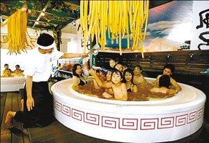 头顶“拉面”、泡在盛满料汤的“面碗”中,洗浴者“别有一番滋味上心头”。