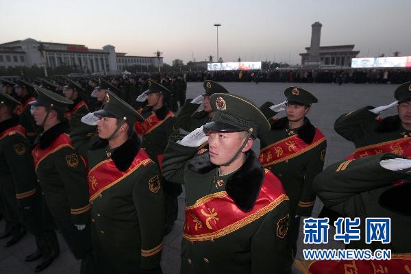 11月24日,参加升旗仪式的武警官兵在天安门广场向国旗敬礼。当日,武警天安门警卫支队即将退伍的官兵在北京天安门广场参加升旗仪式,最后一次以军人的身份向国旗致敬。邢广利 摄