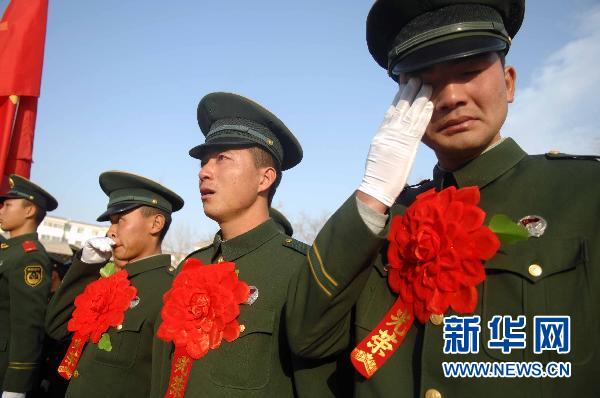 11月23日,武警宁夏总队直属支队即将退伍的老兵在告别仪式上流下了不舍的泪水。彭昭之 摄