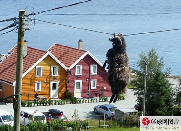绵羊犄角缠电线 挪威小镇上演空中飞羊