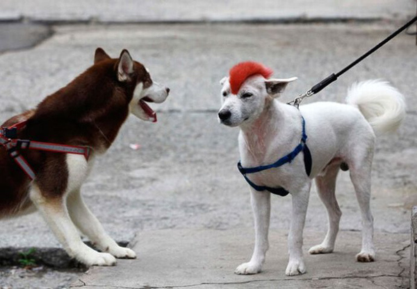 长春市一条大街上,一头朋克造型的酷狗,引来众犬瞩目。