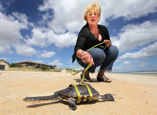 一只叫茉莉的澳大利亚长颈淡水龟,每天都要和主人在艾迪斯威尔海滩优雅地散步。