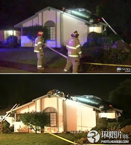 美国加利福尼亚州夫勒斯诺市的居民于2012年1月6日凌晨被一阵巨大声响惊醒,当他们向窗外看去时,却发现一辆车“停”在屋顶。司机是一名25岁的男子,他从前女友家偷了一辆车,在雾天超速行驶撞上人行道,飞上6米高,“停”在了一户居民家的屋顶。这名“倒霉”的小偷随即弃车逃跑,在跳楼的时候摔断了腿。警方不久在附近抓获了该嫌疑人。