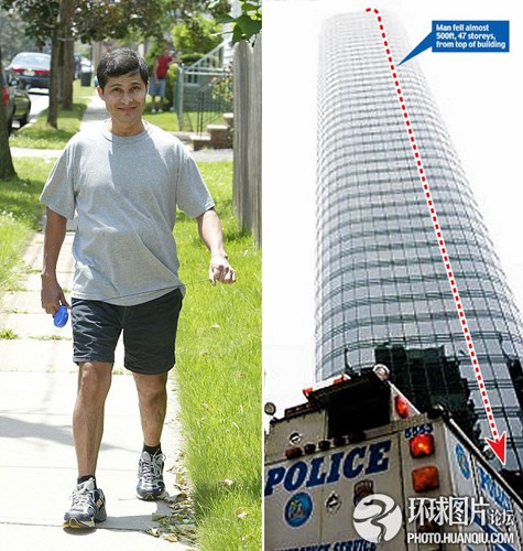 美国纽约市一名清洁工2007年12月8日从47层大厦顶部跌落后奇迹存活。阿尔西德斯·莫雷诺时年37岁,与弟弟埃德加同为纽约一家窗户清洁公司工人。兄弟俩当日在曼哈顿区一栋塔楼顶楼作业时,悬挂式脚手架突然脱落,两人身上未系保护装置,从楼顶跌落到楼下广场。这栋大楼有47层高。埃德加当场丧生,阿尔西德斯却奇迹般生还,随即被送入纽约魏尔康奈尔医疗中心急救。