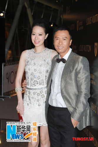 甄子丹与太太汪诗诗一同出席晚会,他表示刚赶回香港,最近忙于拍电影的子丹今晚明显晒黑了而且有点疲倦,他说因为这部电影他除了当演员,还同时是这电影的监制,所以每天除了拍戏还要开会,所以觉得挺累。 太太汪诗诗笑言上个星期子丹回家的时候满脸都是胡子,孩子看到都挺害怕的,觉得好像见到一个坏人,又大赞儿子很有武打的天份,子丹更言在儿子身上感到遗传的厉害:“我没有教过他,但他一岁已经可以自己打一套拳,可能上天安排他有这个天份。”但又言因为觉得当艺人的压力蛮大,而且真的太辛苦,所以不想让儿子当武打巨星。