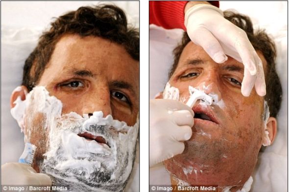 图为土耳其换脸人尤格尔-阿卡在接受面部移植手术后第一次刮胡子。