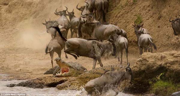 环球网记者朱盈库报道,据英国《每日邮报》3月8日报道,近日,一只角马在随上百万只角马大军跨越非洲马拉河前往肯尼亚进行交配时,在上岸后遭到一条重达500公斤的鳄鱼的威胁。和大多数同类一样,这只角马利用敏捷的动作惊险地逃过了鳄鱼的大嘴。这个千钧一发的时刻被蹲守在附近的摄影师捕捉了下来,为我们呈现了非洲大草原壮观而危险重重的自然景观。