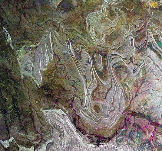 这张照片展现了阿尔及利亚撒哈拉沙漠中的塔奈兹鲁夫特低地,雷达影像显现了崎岖的地表,且色彩明亮度与崎岖程度成正比。实际上,标准的雷达影像是没有色彩的,是通过后期标注来表明实际情况的。这张照片由三张同一区域的雷达影像合成(分别来自2009年3月23日、2009年6月1日、2009年9月14日),不同色彩记录了该地地貌的变化。