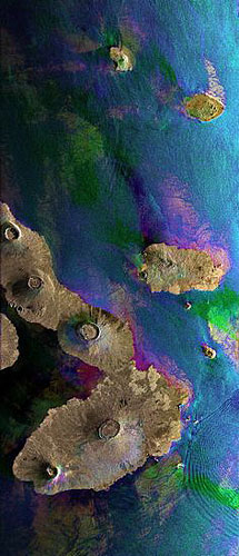 这张照片展现的是坐落在太平洋厄瓜多尔西部1000公里处的加拉巴哥群岛。加拉巴哥群岛最大的岛屿是伊莎贝拉岛(如图)。图中五座火山由北至南分别为:沃尔夫火山、达尔文火山、奥祖罗火山、涅哥拉火山和赛罗阿苏尔火山。图中,伊莎贝拉岛右边较大的岛屿是圣地亚哥岛。这张照片是由三张雷达影像合成(分别来自2006年3月23日、2008年8月14日、2009年1月1日),图中色彩记录了该区域地势变化。与普通地图不同,雷达影像可提供数据用以确定海平面参数,比如风速、风向和波形高度。不同的波类型和风速都在图中清晰可见,如水面上的涟漪一般。