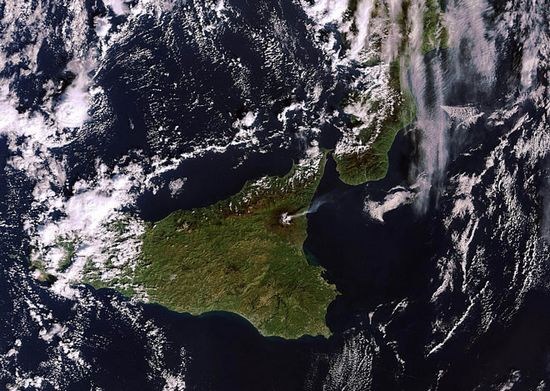 这张照片接收于2011年1月11日,意大利埃特纳火山正向大气层喷出滚滚浓烟。这次火山喷发在次日愈演愈烈,并在夜里达到顶峰。