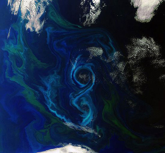 这张照片接收于2011年12月2日,大量茂密的浮游植物在南大西洋呈8字分布,离福克兰群岛东部约600公里。不同种类及数量的浮游植物会呈现出不同的色彩,比如图中的蓝与绿色。恩维萨特卫星可对这些海藻进行监测,一旦它们开始茂盛起来,就有海洋色彩传感器对其叶绿素作出初步鉴别,以判断海藻种类和毒性。(编译/吴丹)