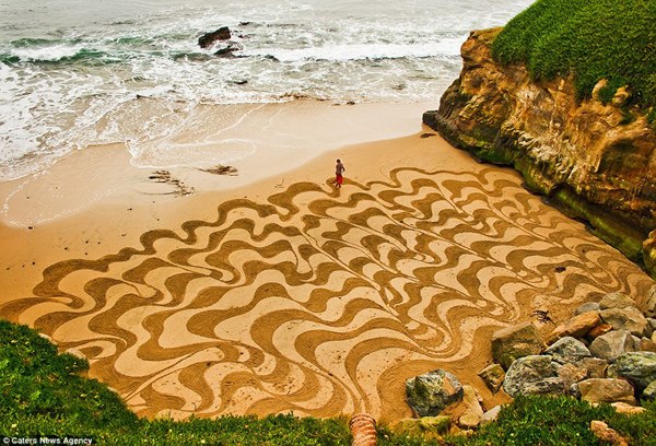 环球网记者朱盈库报道,据英国《每日邮报》3月12日报道,美国艺术家Andres Amador在海滩创作巨幅画作已有12年了。他以耙子为画笔,以沙滩为画布,在涨潮之前将预先设计好的图案和几何图形表现出来,有的画作长500英尺,宽300英尺,既壮观又精美。他说这项喜好的灵感来自英国的麦田怪圈。