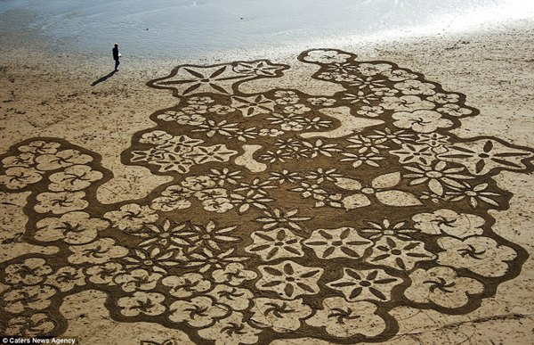 环球网记者朱盈库报道,据英国《每日邮报》3月12日报道,美国艺术家Andres Amador在海滩创作巨幅画作已有12年了。他以耙子为画笔,以沙滩为画布,在涨潮之前将预先设计好的图案和几何图形表现出来,有的画作长500英尺,宽300英尺,既壮观又精美。他说这项喜好的灵感来自英国的麦田怪圈。