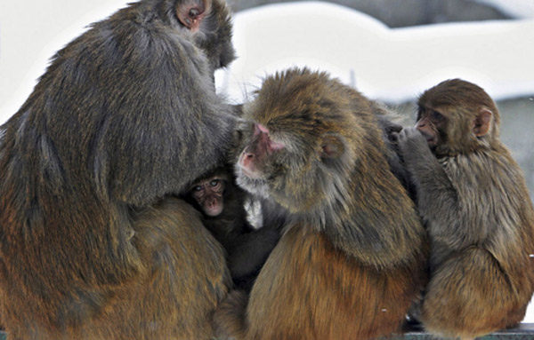 当地时间2012年1月11日,印度斯利那加地区。Tangmarg公园,猴子们挤在一起相互取暖。