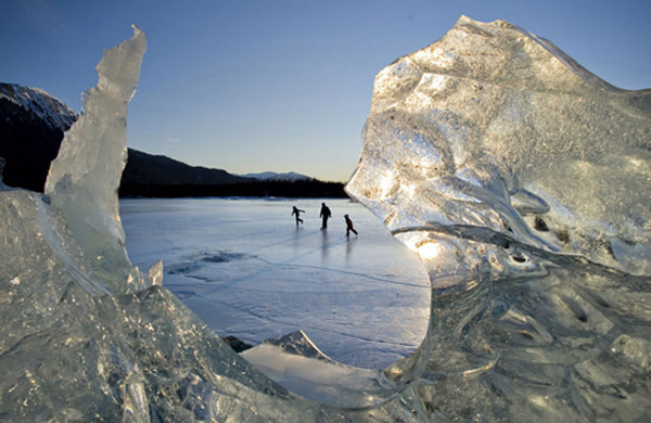 当地时间2012年1月16日,美国阿拉斯加。一家人在Mendenhall湖上滑冰。