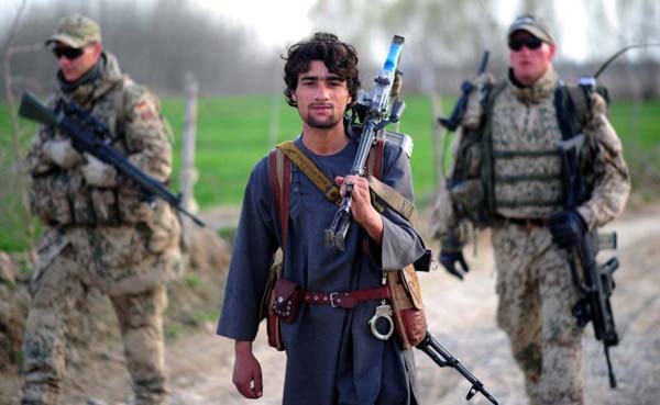 身着民族服装的阿富汗警察肩扛一顶机枪。