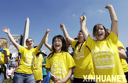几名美国女童子军在华盛顿纪念碑下放声歌唱。