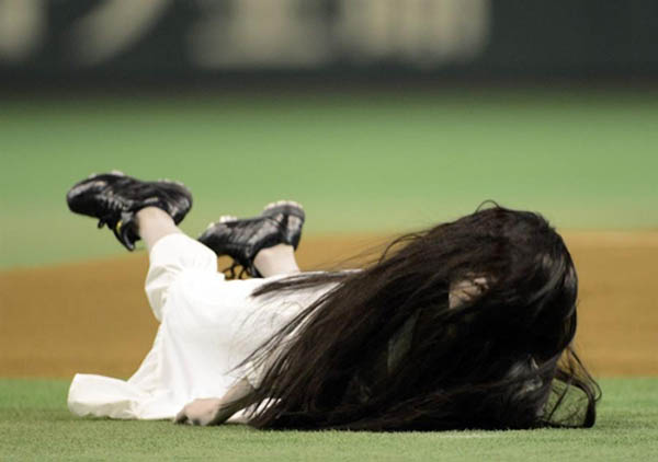 据报道,为宣传即将上映的新片《贞子3D》,该片贞子角色扮演者25日首次来到东京巨蛋体育场,为日本火腿和乐天队的比赛举行了开球式。25日的贞子与电影中如出一辙,白色的连衣裙、黑色的长发遮住眼睛。伴随着全场观众的尖叫,贞子掷出一记绵软无力的坏球,随后“精疲力尽”的倒在地上,俨然一副刚从那口井中爬出来的情景。