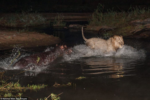 大概又过了两小时后,河马看没有任何动静,就悄悄地走出水谭。两头狮子并没有立刻对河马发起袭击,而是等河马离开水谭50米的时候才开始追捕它。一头狮子跳到了河马的背上,另外一头狮子则有机会控制河马,它们把河马拖拽到水中,将其翻转,等它一动不动了,它们就开始享用丰盛的大餐。