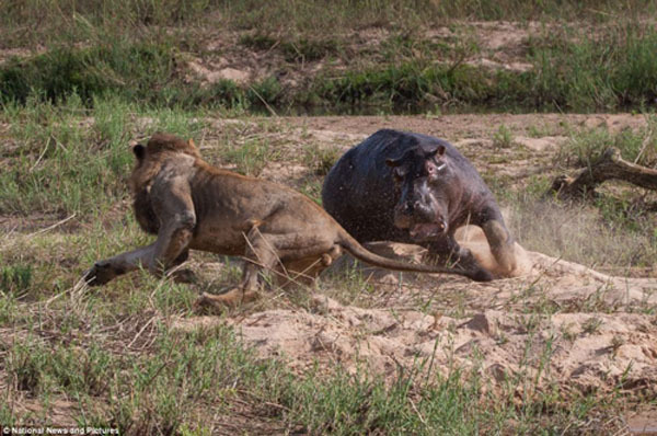 大概又过了两小时后,河马看没有任何动静,就悄悄地走出水谭。两头狮子并没有立刻对河马发起袭击,而是等河马离开水谭50米的时候才开始追捕它。一头狮子跳到了河马的背上,另外一头狮子则有机会控制河马,它们把河马拖拽到水中,将其翻转,等它一动不动了,它们就开始享用丰盛的大餐。