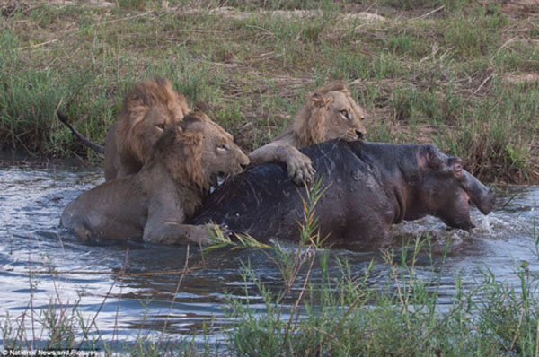 大概又过了两小时后,河马看没有任何动静,就悄悄地走出水谭。两头狮子并没有立刻对河马发起袭击,而是等河马离开水谭50米的时候才开始追捕它。一头狮子跳到了河马的背上,另外一头狮子则有机会控制河马,它们把河马拖拽到水中,将其翻转,等它一动不动了,它们就开始享用丰盛的大餐。