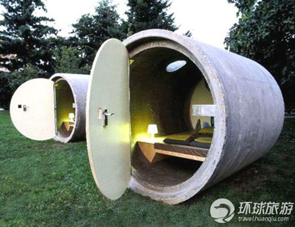 这个旅馆是由废弃的管道改装而成的,位于奥地利的一个公园内。管道里的设施有泡沫的垫子、床下储物空间和一个插座。