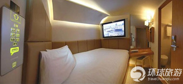 这个酒店的设计类似一个奢华游艇的船舱,狭小舒适的空间里有双人床、42英寸的等离子电视。