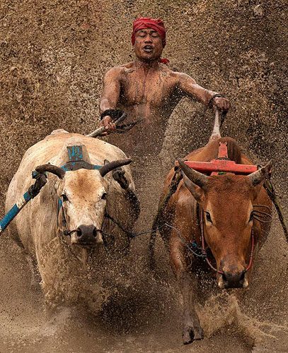 据英国《太阳报》5月17日报道,水田赛牛是印度尼西亚庆祝丰收的传统活动。在比赛中,当地农民驾着两头壮牛,紧拽牛尾,从泥泞的水田中风驰而过。比赛者有时还会咬牛的尾巴让牛加速。虽然赛场泥水四溅,但有趣刺激的比赛充分表达了当地农户丰收的喜悦。