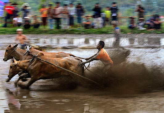 据英国《太阳报》5月17日报道,水田赛牛是印度尼西亚庆祝丰收的传统活动。在比赛中,当地农民驾着两头壮牛,紧拽牛尾,从泥泞的水田中风驰而过。比赛者有时还会咬牛的尾巴让牛加速。虽然赛场泥水四溅,但有趣刺激的比赛充分表达了当地农户丰收的喜悦。