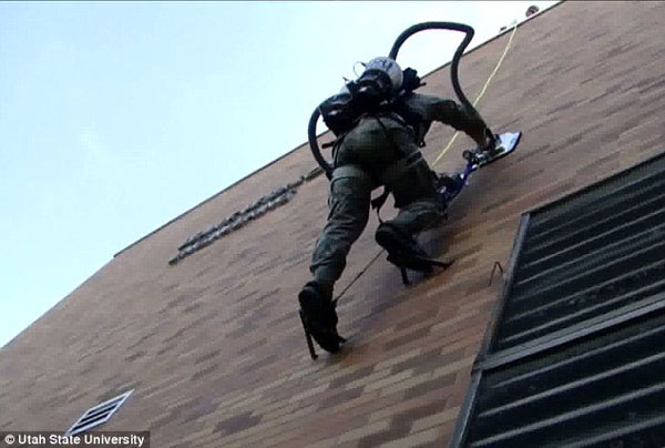 【环球网综合报道】 美国犹他州州立大学的学生工程师们建造出名为“Ascending Aggies”的真空吸盘。该装置由电池驱动,外形类似于旧背包。通过向上、向下、远离等多种动作,该装置可以攀爬90英尺高的任意物体表面。