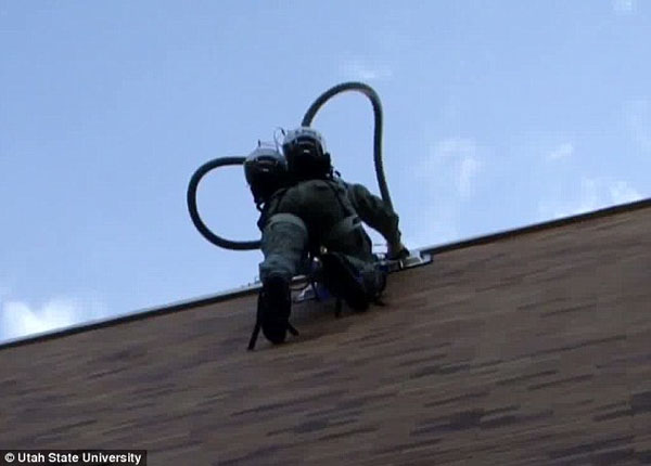 【环球网综合报道】 美国犹他州州立大学的学生工程师们建造出名为“Ascending Aggies”的真空吸盘。该装置由电池驱动,外形类似于旧背包。通过向上、向下、远离等多种动作,该装置可以攀爬90英尺高的任意物体表面。
