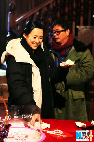 当天,拍摄完一场外景戏后,在转场布光的时间里,导演突然要求所有工作人员进大堂开一个临时调整会。正在准备换装中的章子怡接到通知后走进大堂,却看见楼梯前突兀的摆放着一张摆着蛋糕和水果的椭圆形桌子,立刻明白了剧组的精心安排,开心的笑了起来,之后,果然不负剧组人员给她起的“手机拍照狂”称号,掏出电话开始对着蛋糕一顿猛拍……