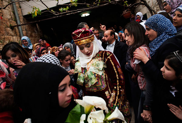 当地时间4月12日,在靠近纳布卢斯约旦河西岸的一个村庄里,新娘Maha Surougi走到新郎Thaer Qasem的面前。据悉,这对新人是拥有巴勒斯坦血统的叙利亚人,因此巴勒斯坦政府邀请叙利亚公民参加了此次婚礼。
