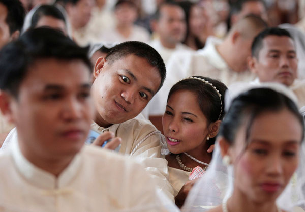 当地时间6月17日,一场盛大的集体婚礼在菲律宾马尼拉的一个教堂中举行。图中一对新人正用手机拍下他们扮鬼脸的照片,记录这人生中最幸福的瞬间。
