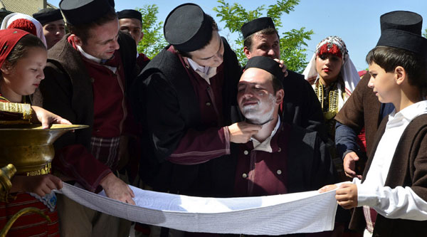 当地时间6月15日,马其顿,在传统的Galicnik婚礼庆典上,当地最富盛名的贤人为新郎Trajce Lozanoski刮胡子。