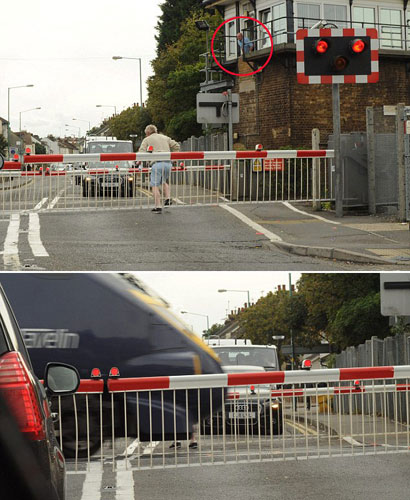 2012年9月,英国一名61岁的老人在火车即将驶来之际,执意横穿铁路轨道,却不知即将驶来的是时速达140英里的高速火车。老人在跨越第一道围栏后,不慎跌倒在铁轨中央,这让停坐在车里的人们惊吓不已。就在火车即将撞上他的前一刻,老人再次爬起,跨越另一道围栏,逃过一劫。摄影师史蒂夫正巧也在等待火车通过的现场,便拍下了这位冒失莽撞的老人翻越围栏的情景。
