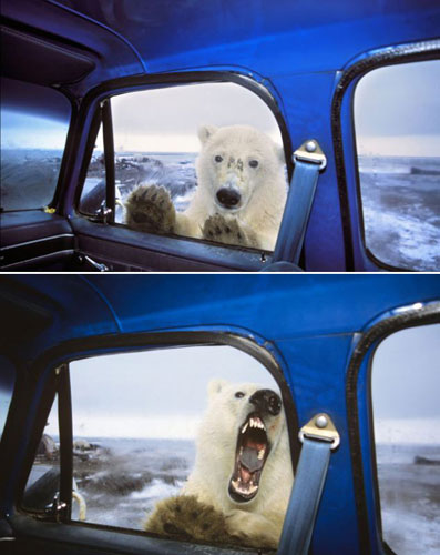 北极熊看起来温顺的很,但当它真的出现在你面前是恐怕又是另一番景象。2011年4月,来自美国的摄影师汤姆·利森在阿拉斯加北部海岸的巴特勒岛进行野外拍摄,当时他们正在追踪两只北极熊外出觅食。可能是由于距离过近的缘故,一只北极熊突然发现了汤姆的车子,并开始走到了车窗前。但是紧接着他展现出了黑暗的一面,开始用大声的咆哮,紧接着它又用它的前爪开始拍打车窗的玻璃。随后司机发动汽车吓走了北极熊,否则很有可能遭遇到生命危险。
