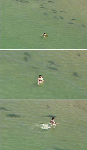 2008年9月,在美国加利福尼亚州的玛丽安德尔海滩,一名在海中畅游的妇女在毫不知情的情况下游入鲨群,与鲨鱼来了个“亲密接触”,起初这名妇女显然没有察觉到她已经被鲨鱼包围,直到发现身边有一条鲨鱼游过才吓得大惊失色,立即折返逃命。这惊险的一幕恰巧被当地一位正在进行航拍的摄影师记录了下来。