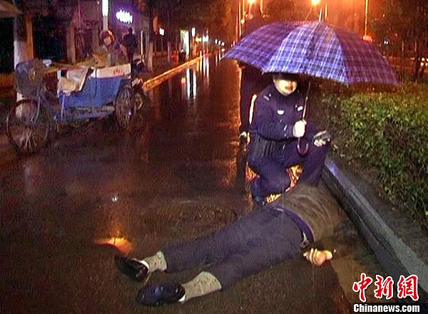 12月1日晚上十点左右,一名男子骑着燃油助力车行驶到南京建邺区湖西街的安康小区附近时,由于视线不好,一头撞到停在路边的一辆保洁车上,当场昏迷不醒,过路市民和保洁工立即报警。男子倒在雨夜里,不省人事,头部流出鲜血,赶至的110民警让人感动,他蹲在男子身边,为其撑着伞,而自己的身上却早已被雨水淋湿。雨田 摄 图片来源:CFP视觉中国