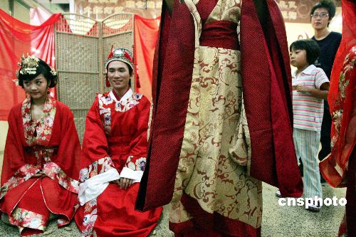 中新网9月24日电 24日,由“汉衣坊”、大红灯笼婚庆公司主办的中国首次汉民族传统婚礼的展示活动在北京西单109婚纱广场开幕。
