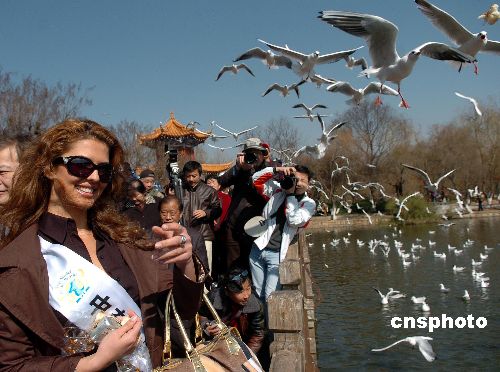 参加第十四届世界顶尖超级模特大赛的佳丽们2月10日来到昆明大观楼公园,与每年冬天到昆明过冬的海鸥来了一次“亲密接触”。本届世界顶尖超级模特大赛总决赛将于二月十四日在昆明举行。中新社发 石雨 摄
