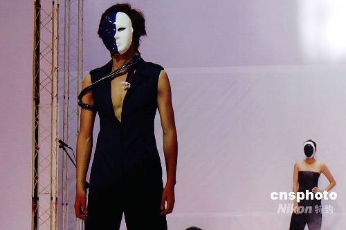 图为戴面具的模特展示上海大学巴黎国际时装艺术学院的原创服饰。据悉,该作品灵感来源于被压抑的现代都市人。中新社发 孟幻 摄