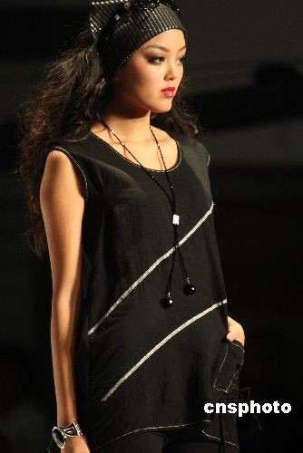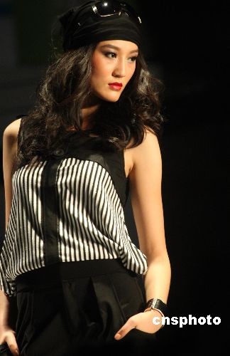 11月23日,正在广东虎门举行的第13届中国(虎门)国际服装交易会,某香港品牌推出“水墨樱花 黑白天下”时装发布会。结合国际流行元素,加之一贯的优雅风格,作品运用黑白的时尚,演绎女性的性感和优雅。中新社发 钱兴强 摄