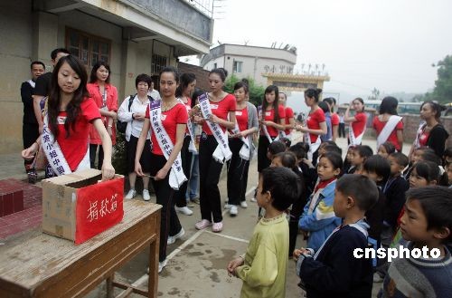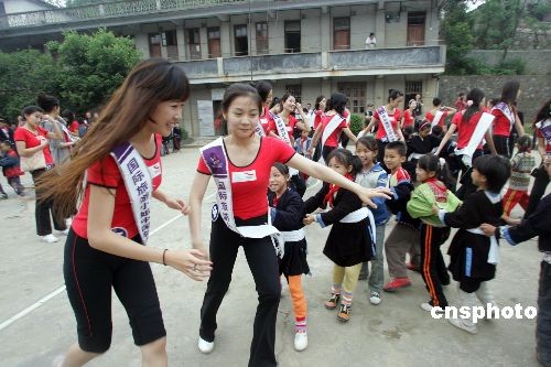 4月23日,在广东参加2009国际旅游小姐中国区总冠军的61位选手来到连南县的贫困小学南岗小学,慰问师生。她们和孩子们一起做游戏,并捐款奉献爱心。中新社发 劳友 摄