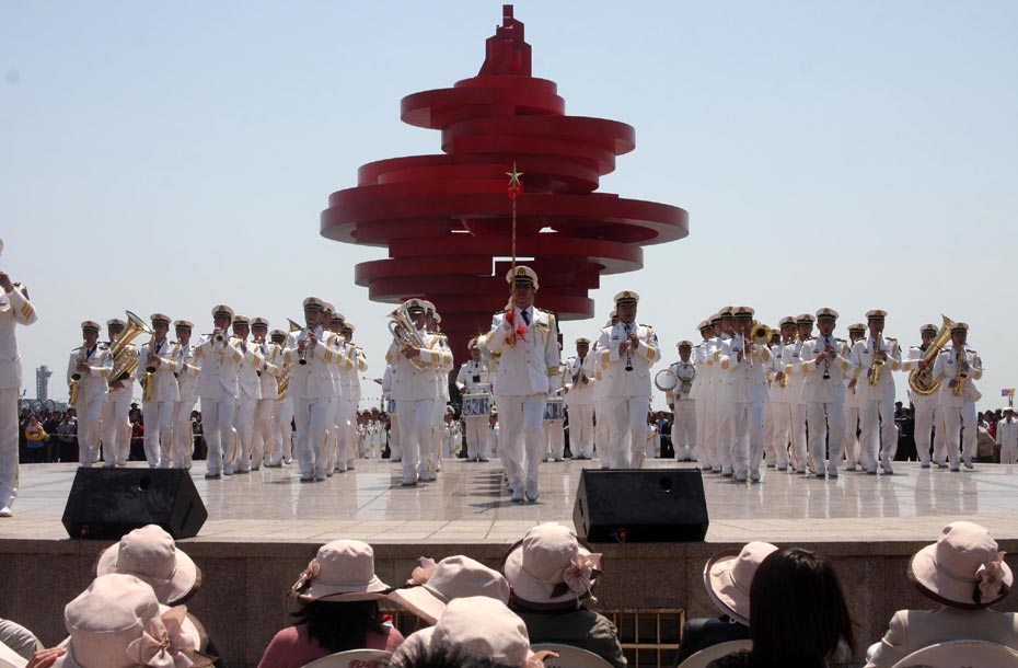 4月21日,来自美国、俄罗斯、韩国、印度、孟加拉国、巴西、中国等7国海军的8支军乐团在山东青岛联合举行以“欢乐海洋”为主题的多国海军军乐团联合演出活动,用不同风格的音乐架起一座友谊之桥。该活动为庆祝中国海军60周年纪念活动之一。中新社发 郭国权 摄