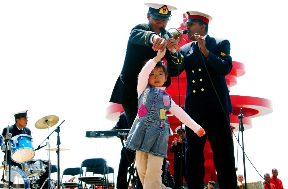 4月21日,在庆祝中国人民解放军海军成立60周年多国海军活动“欢乐的海洋”军乐队联合演出时,一名青岛小女孩上台参与孟加拉海军舰艇乐队联欢。同时,韩国、俄罗斯、印度、美国、巴西来访舰艇乐队和中国海军军乐队、北海舰队军乐队参加了联欢演出。 中新社发 宋吉河 摄