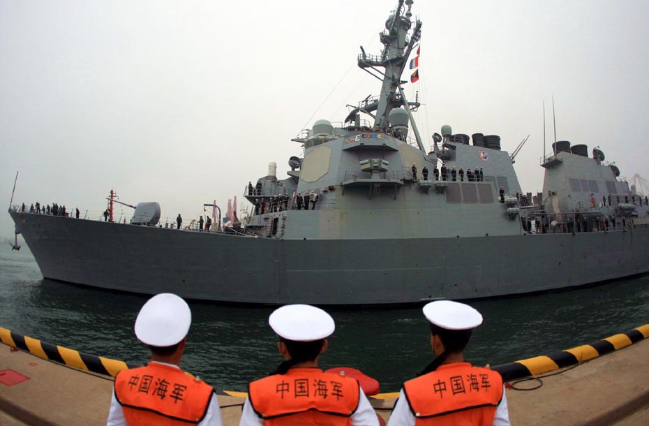 4月19日,来自11个国家的17艘舰艇先后抵达青岛港码头,参加海上阅兵。这是美国海军“菲茨杰拉德”号驱逐舰到港时情景。 中新社发 张雷 摄