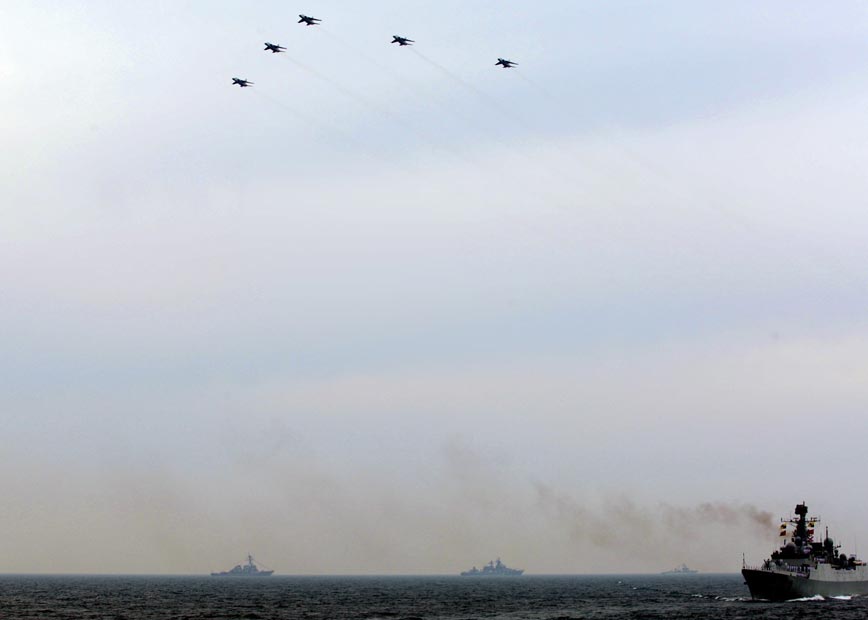 中国历史上的首次多国海军检阅活动二十三日下午在青岛附近黄海海域举行。中国国家主席、中央军委主席胡锦涛乘阅兵舰“石家庄”号导弹驱逐舰,检阅中国海军的潜艇、水面舰艇、海军航空兵和海军陆战队等作战兵种,并检阅了来访的十四个国家的二十一艘舰艇。 中新社发 宋吉河 摄